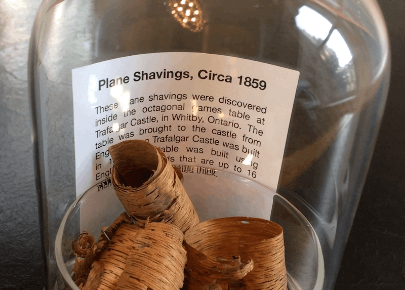 During the table restoration, I discovered some wood shavings in the table base column, which I suspect would have been from the original craftsman some time around 1850 in England. Wow, what a find! I kept some in the table base to retain that history and I put a few shavings in a display case for the Trafalgar Castle staff to put on display when they host tours.