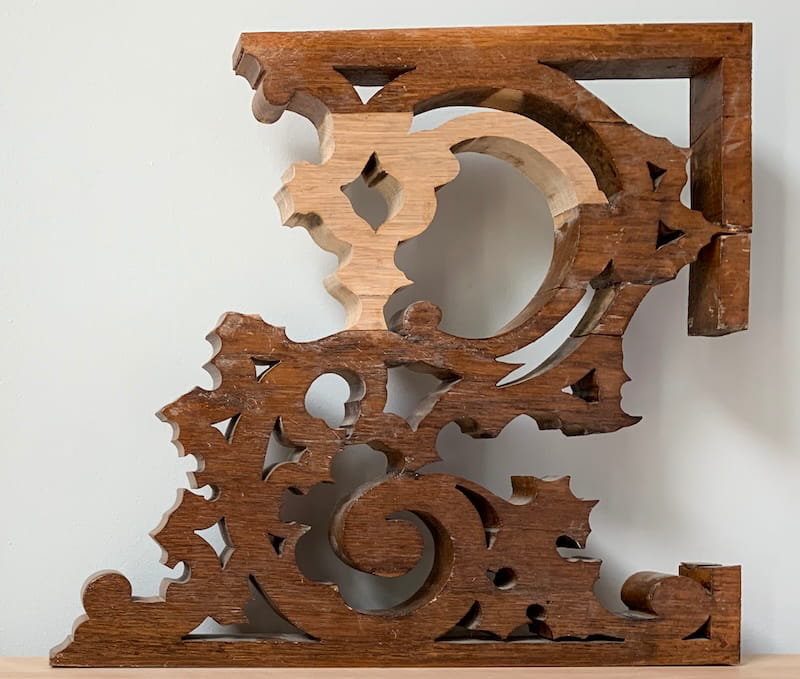 Working on historic furniture requires attention to detail, patience, and years of experience to ensure it isn't damaged in the process. The table we restored is in photos with the original owner of Trafalgar Castle. The facilities staff believe it was brought over from England when the Castle was built in 1859. The wood is English Oak, so that aligns with these details. The finish on the table was in good shape but the structure of the table base needed a lot of repair. The scrollwork on the table base was split in some places and it had pieces missing that had to be remade and stained to disguise the repair work.